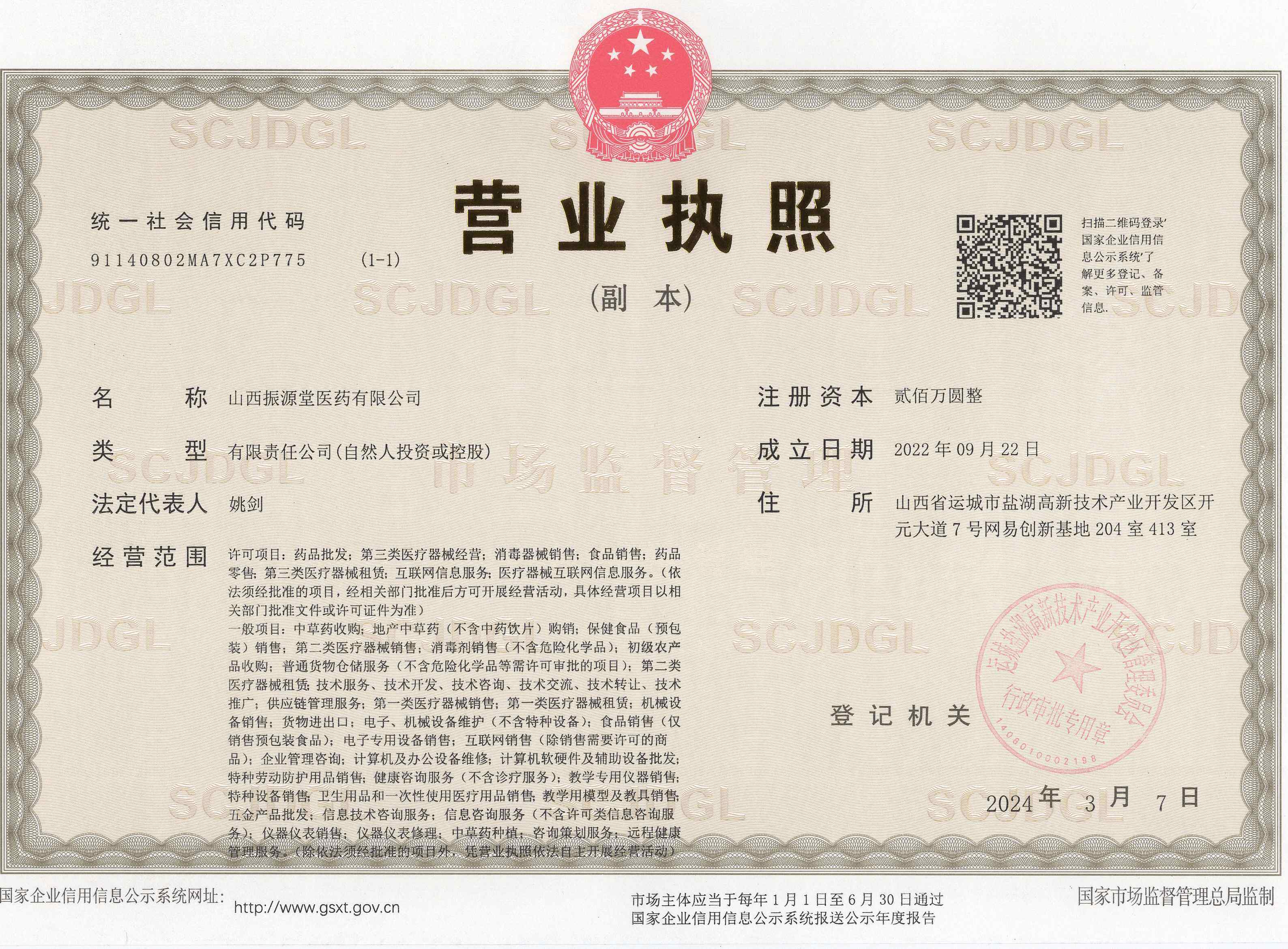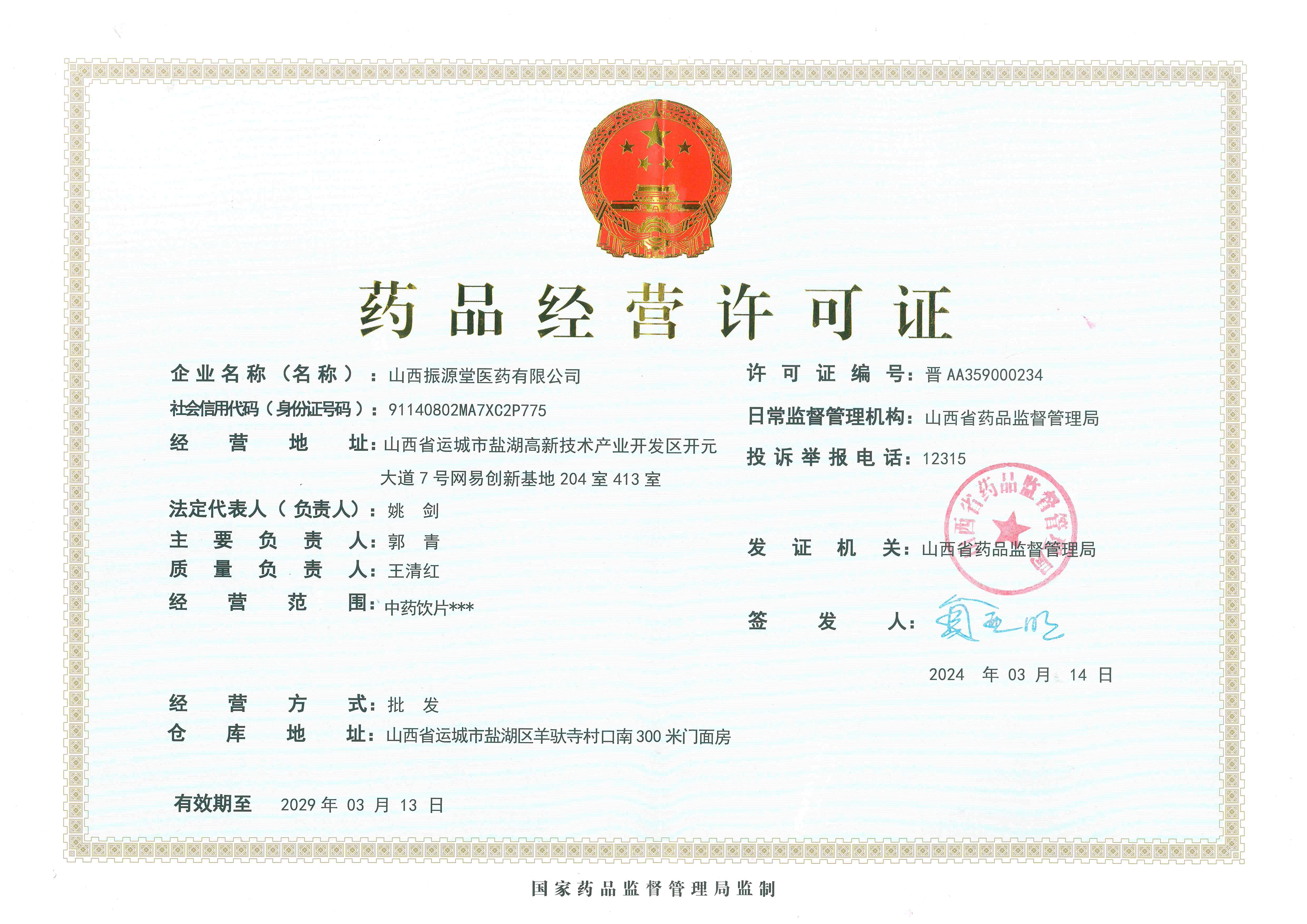 山西振源堂医药有限公司,为一家专营中药饮片的医药批发企业。成立于2022年09月22日,注册资本贰佰万元人民币。2024年03月14日通过山西省药品监督管理局批准。注册地址为山西省运城市盐湖高新技术产业开发区复旦大街东延线与振兴大道交叉口路西-亚宝医药办公楼4楼,仓库地址为山西省运城市盐湖区羊驮寺村口南300米门面房,经营场所面积100平方米。 仓库总面积1100立方米,库区设为恒温库(10-20℃),库区设置均满足GSP的要求。